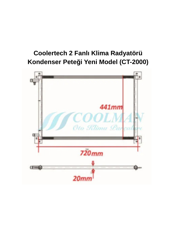 Coolman ve Coolertech’in üstün mühendislik anlayışı ile AR-GE çalışmalarımız sonucu geliştirilen CT-2000 klima radyatörü kondenser peteği, 2 fanlı yeni nesil tasarımı ile yüksek performanslı bir soğutma çözümü sunar. Gelişmiş yapısı sayesinde klima sistemlerinde maksimum verimlilik sağlayarak özellikle minibüs ve ticari araç uygulamalarında güçlü bir performans ortaya koyar.