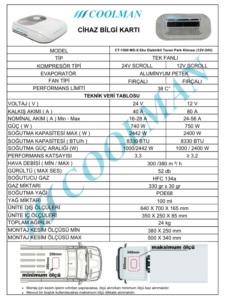 CT1500 Split Elektrikli Klima Seti (12V-24V) Ürün Açıklaması Coolman CT1500 Split Elektrikli Klima Seti (12V-24V), araç kabinlerinde motor çalışmadan etkili