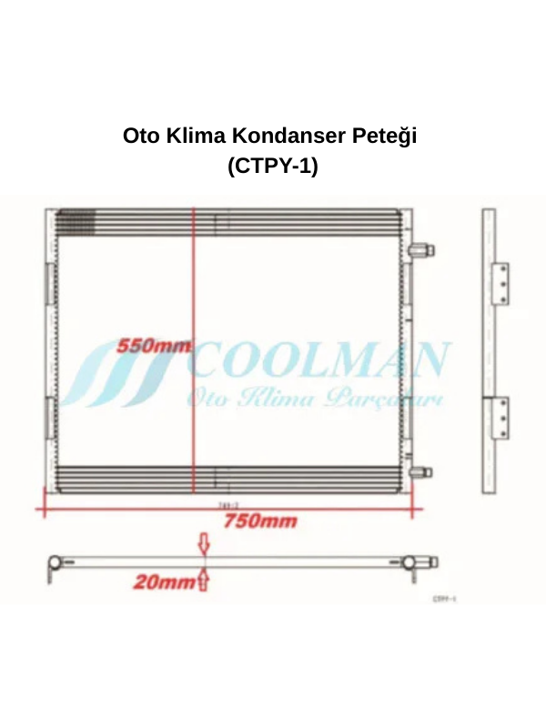 Coolman ve Coolertech’in üstün mühendislik anlayışı ile AR-GE çalışmalarımız sonucu geliştirilen CTPY-1 oto klima kondenser peteği, özellikle Yılkar marka 2 fanlı klima sistemleri için tasarlanmış yüksek performanslı bir klima radyatörü modelidir. Geniş yüzey alanı ve optimize edilmiş yapısı sayesinde güçlü soğutma performansı sağlayarak araç klima sistemlerinin daha verimli çalışmasını destekler.