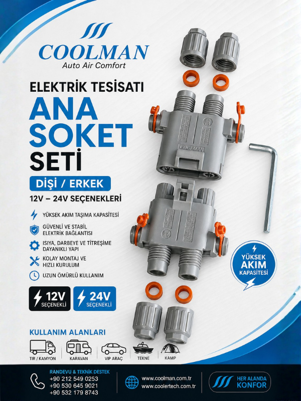 Coolman Elektrik Tesisatı Ana Soket Seti, portatif klima ve araç buzdolabı sistemlerinde güvenli, sağlam ve uzun ömürlü elektrik bağlantısı sağlamak amacıyla geliştirilmiş profesyonel bir bağlantı çözümüdür. Dişi ve erkek soketlerden oluşan set yapısı sayesinde sistemler arası hızlı ve hatasız bağlantı imkânı sunar.