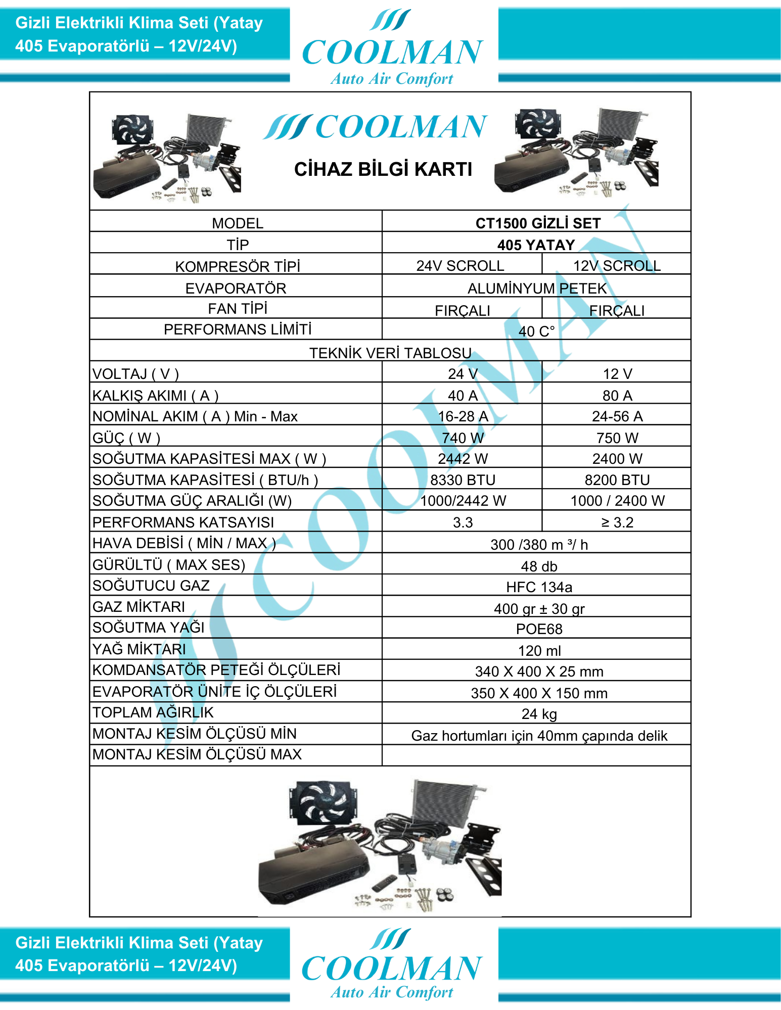 Coolman Gizli Elektrikli Klima Seti (Yatay 405 Evaporatörlü – 12V/24V), araç kabinlerinde motor çalışmadan soğutma sağlayan yüksek verimli bir split elektrikli araç klima sistemi çözümüdür. Yatay tip evaporatör tasarımı sayesinde dar kabinli araçlarda kolay montaj imkanı sunarak tır kabin kliması, kamyon kabin kliması, karavan kliması ve mobil araç klima sistemi olarak profesyonel kullanım sağlar.