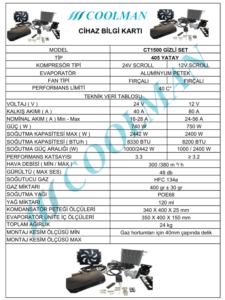 Coolman ve Coolertech mühendisliği ile geliştirilen bu gizli klima sistemi, 12V ve 24V araç elektrik altyapıları ile uyumlu çalışarak farklı araç segmentlerinde güvenli kullanım sunar. Scroll kompresör teknolojisi sayesinde 2400W seviyesine kadar güçlü soğutma kapasitesi sağlayarak sıcak yaz günlerinde araç kabinini kısa sürede serinletir.