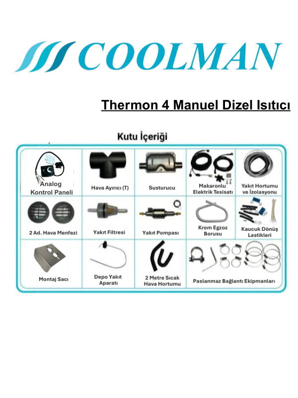 Ana Sayfa Isıtıcılar Coolman Webasto Tipi Thermon 4 Manuel Dizel Isıtıcı 5 kW (12-24V)